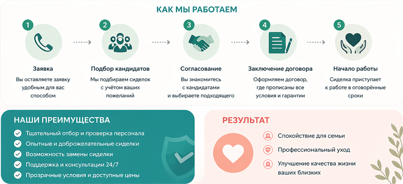 Подбор сиделки + сопровождение включают: